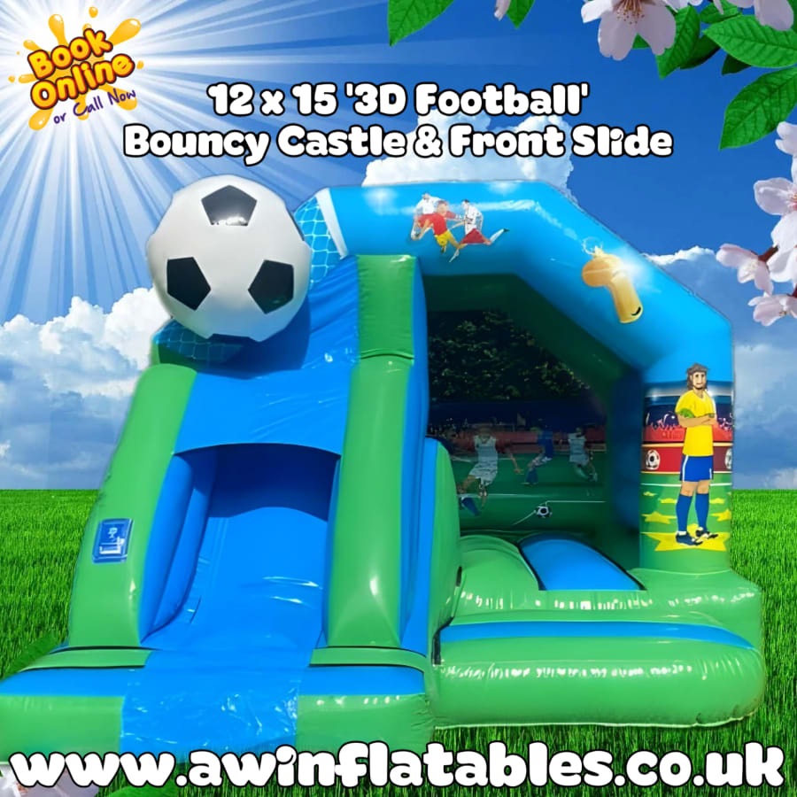 Get ready for an action-packed inflatable experience with our 15x12 3D Football Bouncy Castle with Slide! Perfect for little football fans, this exciting bouncy castle features a vibrant football theme with 3D elements and a front slide for even more fun.
