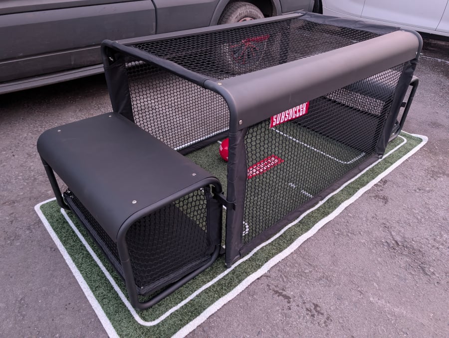 Subsoccer is an innovative 1v1 table football game where you and your opponent sit down, defend your goal, and score by kicking the ball under your opponent’s seat – all while staying seated! It’s a unique twist on traditional football that adds a hilarious challenge and a competitive vibe. Simple rules, epic fun!