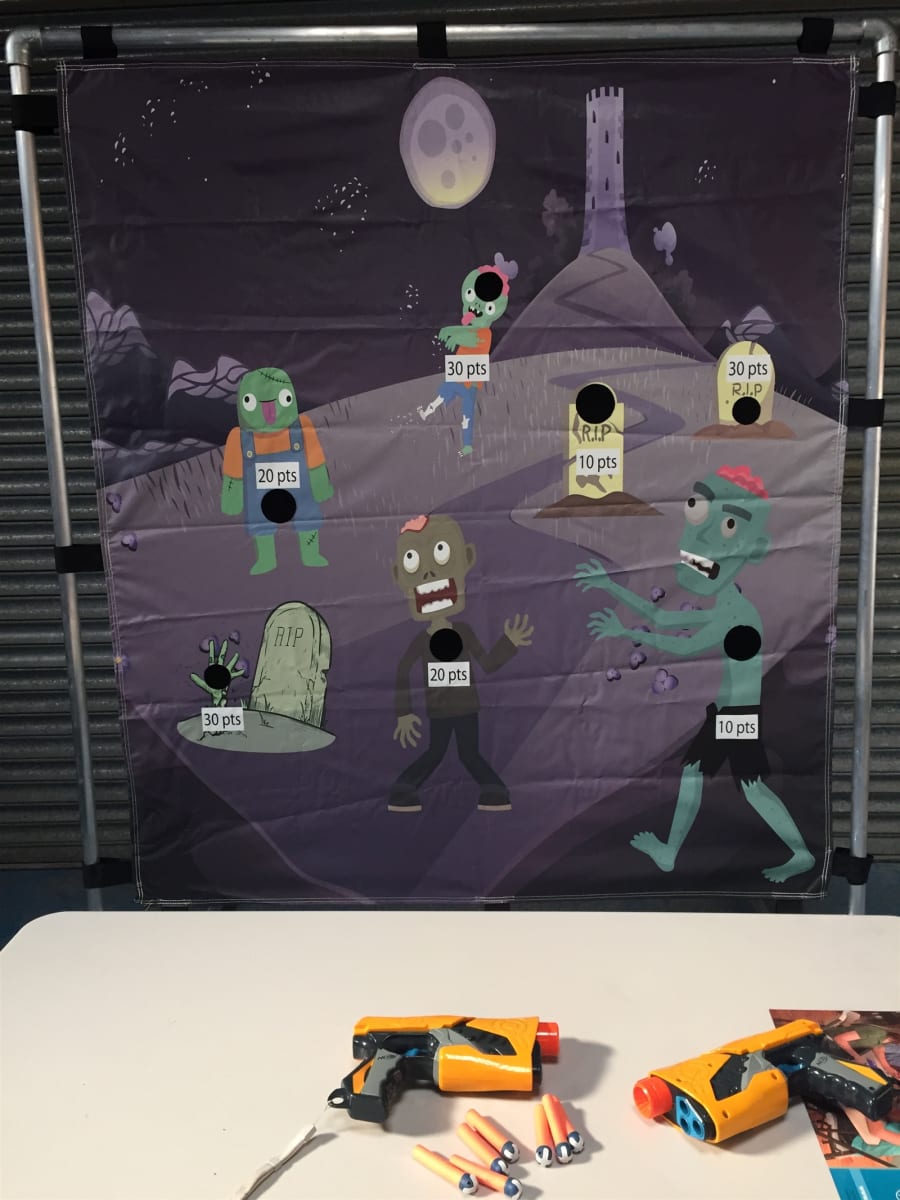 From kids’ birthday parties to corporate team-building, this Zombie Nerf Shoot and Stick Game will have everyone gunning for glory! Watch the friendly competition heat up as everyone gets in on the action – who will get the highest score? (Pro tip: it’s probably you.)