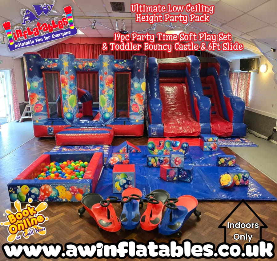 Bring safe, fun, and action-packed play to indoor venues with height restrictions with our Ultimate Low-Ceiling Party Pack! Designed for toddlers and young children, this all-in-one package combines a 19-piece soft play set, a 10 × 13 low-ceiling bouncy castle, and a 6ft platform slide, creating hours of safe entertainment in compact indoor spaces.