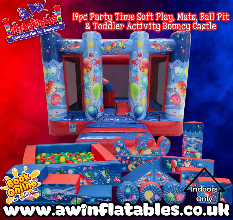 Add colour, fun, and Happy play to your event with our 19-Piece Red & Blue Party Time Soft Play Set & Bouncy Castle. This bright and cheerful package is perfect for toddlers and young children, combining classic soft play shapes with a fun party-themed bouncy castle for hours of entertainment.