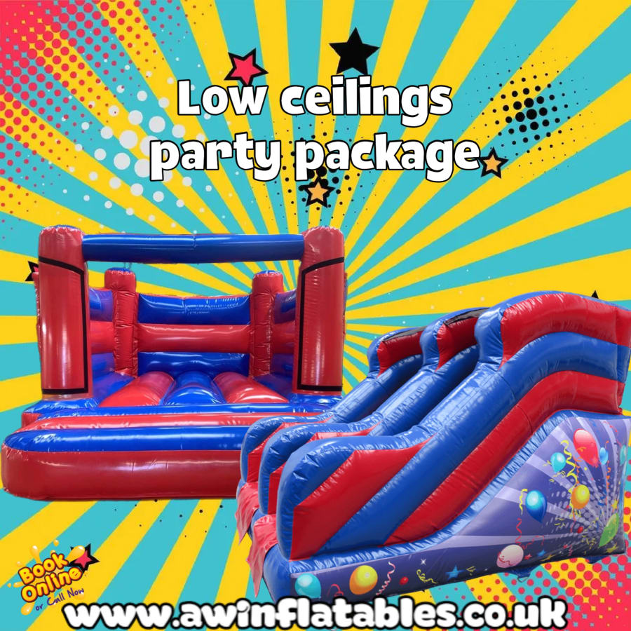 This package is perfect for indoor events with low ceiling heights. It includes an 11x15 red and blue bouncy castle with a vibrant party theme, along with a 6ft Fun Mini Slide. Whether you’re hosting a birthday party, a family gathering, or a community event, this package is designed to provide endless fun and entertainment for children.